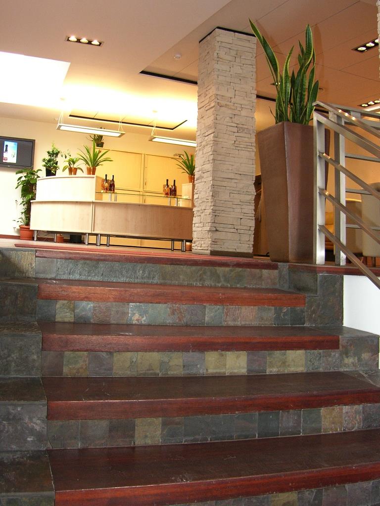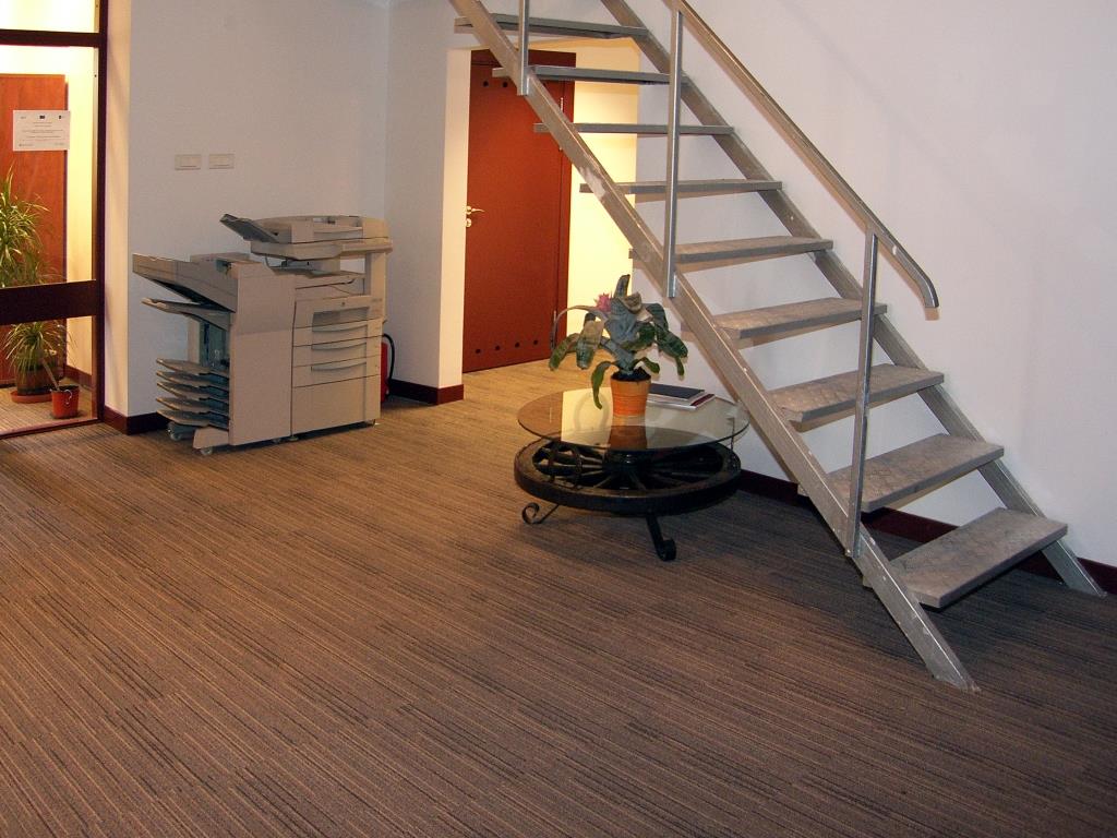 W obiekcie wykonaliśmy wyrównanie podłoża masą reperacyjną RS88 po wcześniejszym zagruntowaniu gruntem R777. Następnie, na klej P600, ułożyliśmy parkiet. Po montażu został on wycyklinowany i zaolejowany. Naprawę schodów wykonaliśmy poprzez skucie starej warstwy cementowej i wylanie masy samopoziomującej DX, po zagruntowaniu gruntem R777, na każdym stopniu oddzielnie. Na tak przygotowanych stopniach schodowych wykonaliśmy montaż trepów z drewna Jatoba, które następnie zostały wyszlifowane i zaolejowane. Wykładziny dywanowe w płytkach zamontowaliśmy na przeszpachlowanym masą RS88 podłożu, mocując poszczególne płytki za pomocą emulsji antypoślizgowej Tackifier T425.